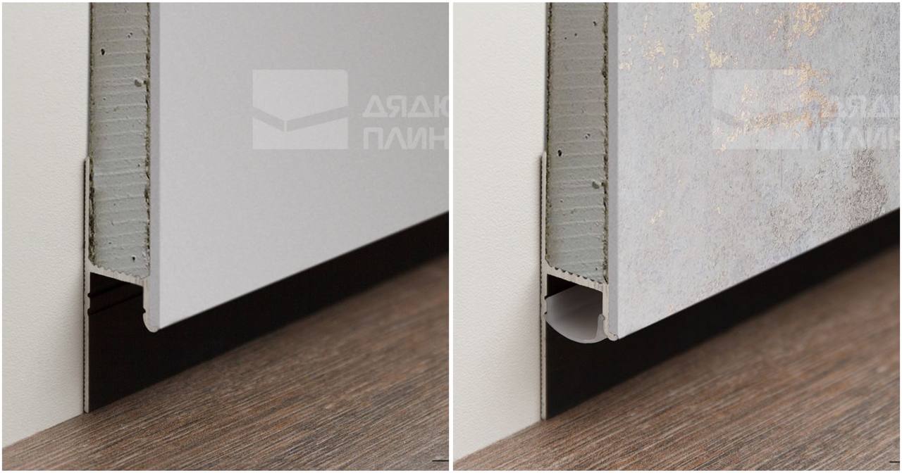 Использование такого плинтуса позволит устанавливать мебель близко к стенам, сделает изящной эксплуатацию систем раздвижных дверей. Этот вид плинтуса предполагает установку гипсокартона на существующие стены. Вишенкой на торте - это использовать классный дизайнерских прием, плинтус с LED-подсветкой.